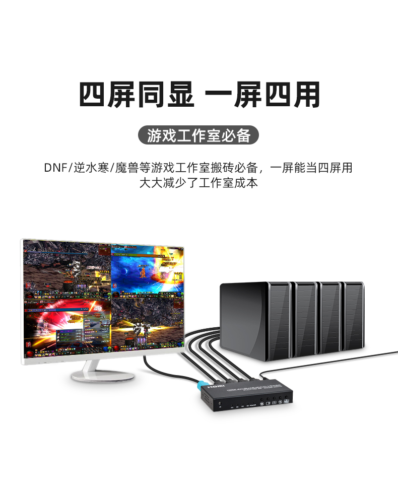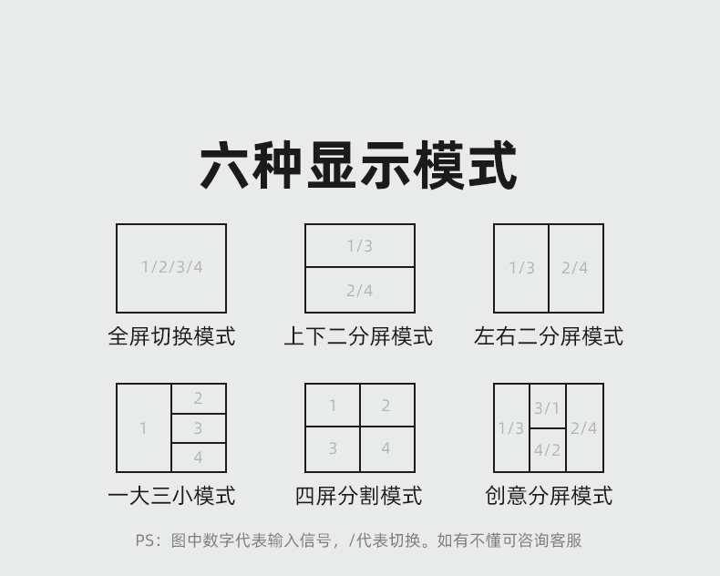 2.顯示模式:六種顯示模式(全屏切換模式/上下二分屏模式/左右二分屏模式/一大三小模式/四屏分割模式/創(chuàng)意分屏模式)