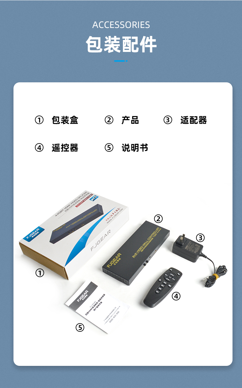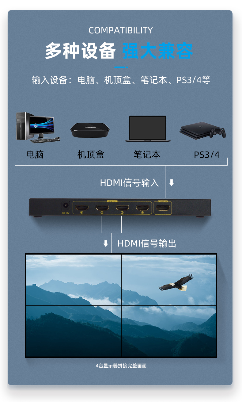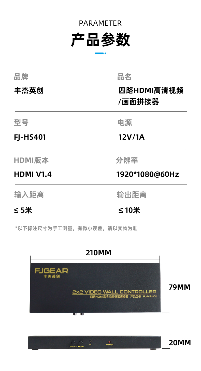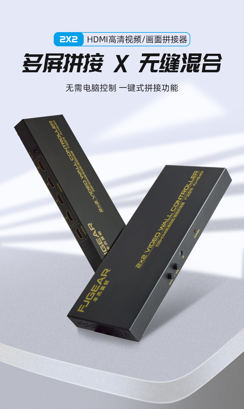 FJ-HS401產(chǎn)品是一款四路HDMI高清視頻/畫(huà)面拼接器,由1路HDMI高清視頻信號(hào)輸入到拼接器,拼接器對(duì)視