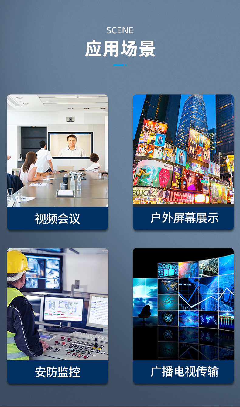 頻處理后輸出并傳輸?shù)接脩糁付ǖ?-4個(gè)顯示屏上,拼接起來(lái)即可組合成一個(gè)大型顯示屏,具有畫(huà)質(zhì)清晰,響應(yīng)速度