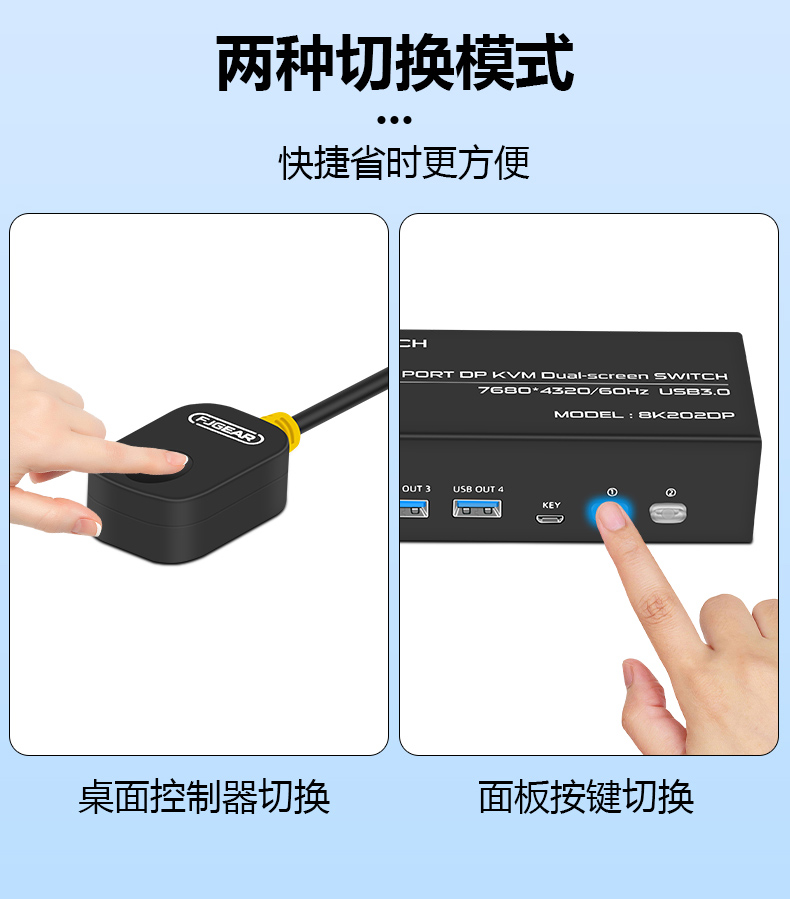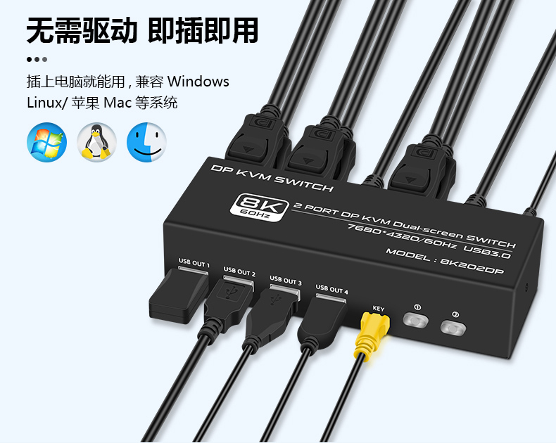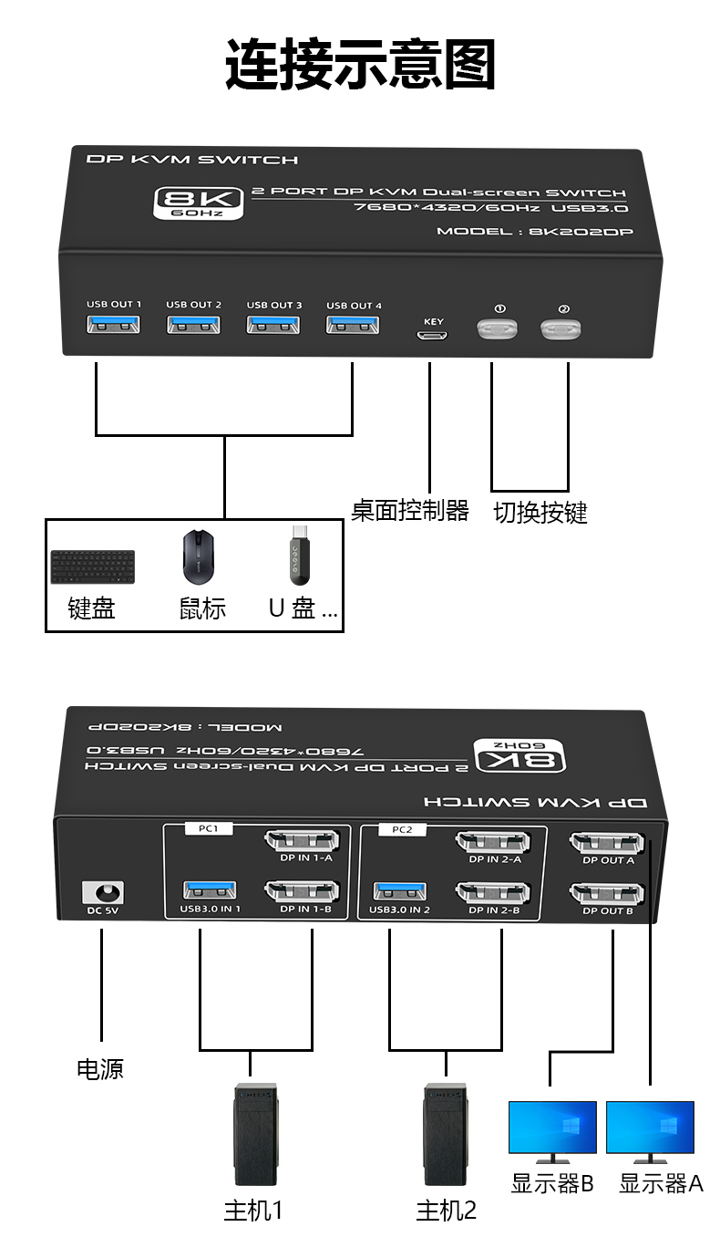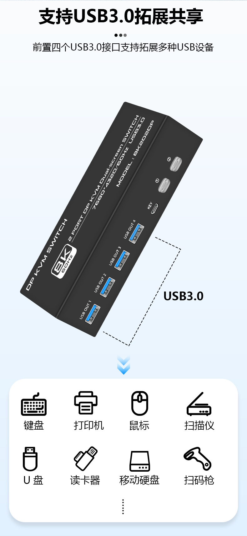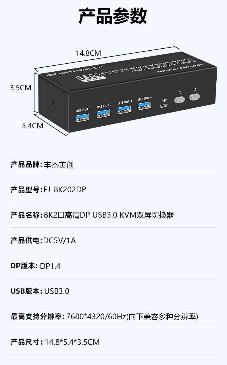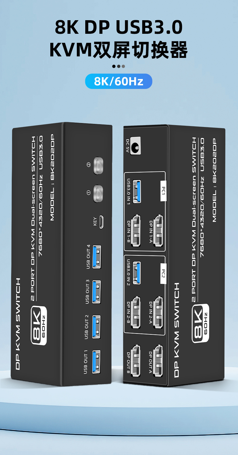 3.產(chǎn)品名稱:8K 2口高清 DP USB 3.0KVM 雙屏切換器