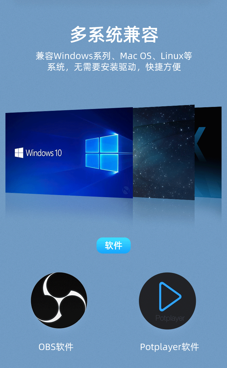 12.兼容軟件:OBS直播軟件,potplayer,ClonerAlliance,USB攝像/錄像軟件等