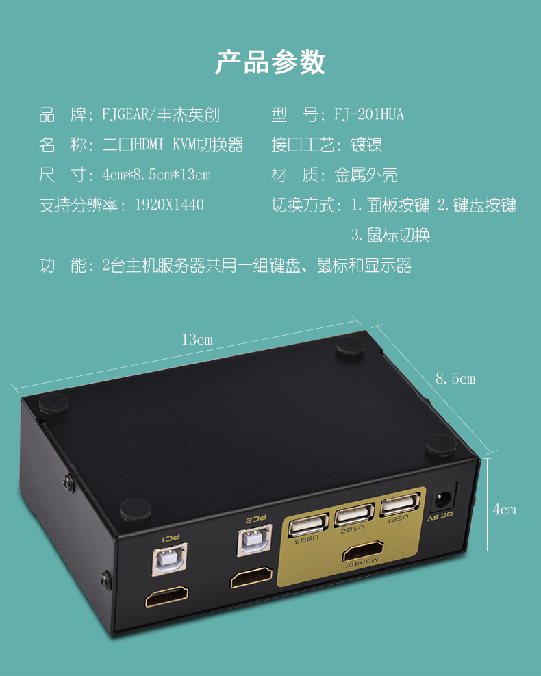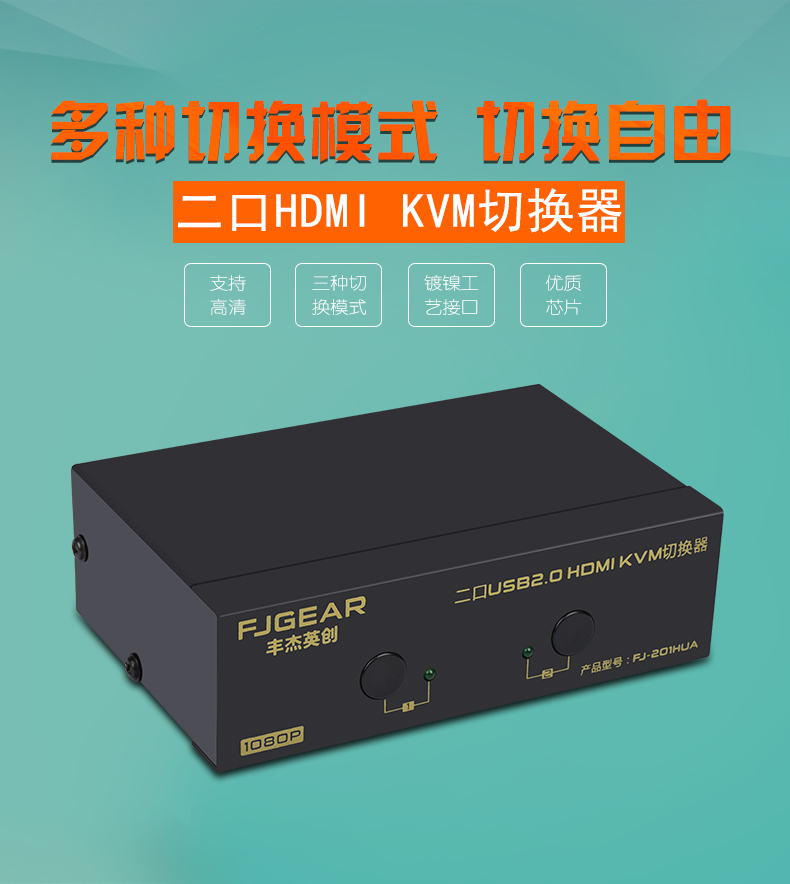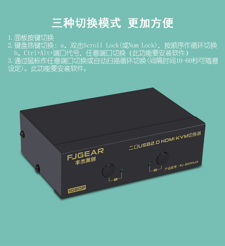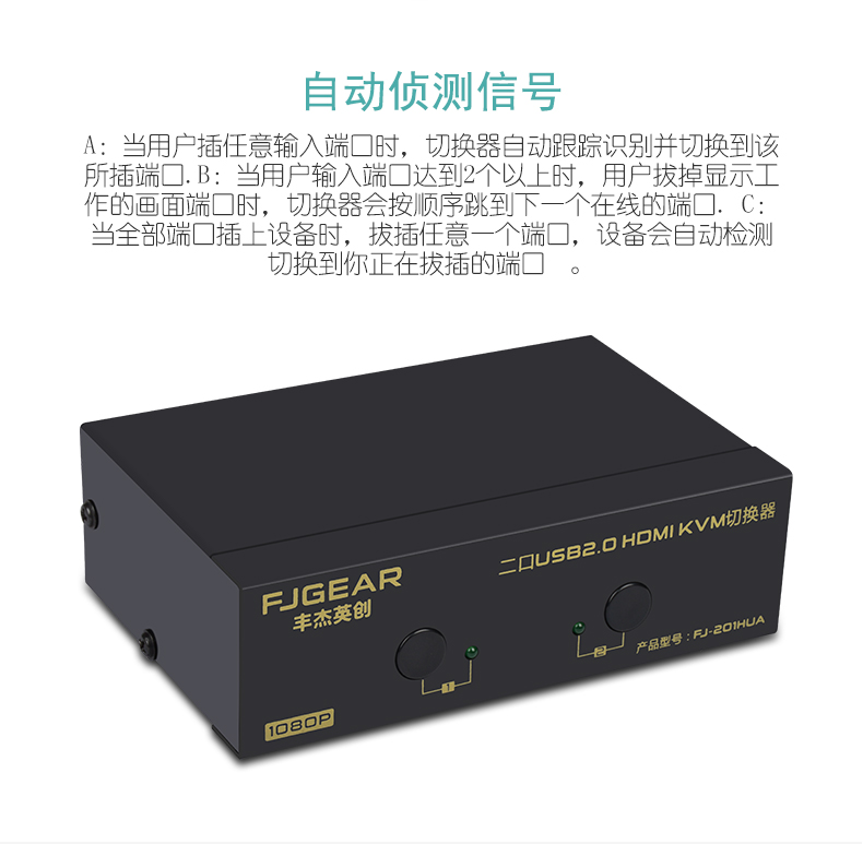 FJ-201HUA整合2端口KVM多電腦切換器,該款產(chǎn)品支持2臺電腦之間或是共它設(shè)備如游戲的HDMI信號切換,并讓使用者從單一控制端分享USB接口設(shè)備FJ-201HUA提供先進的獨立切換功能,使用者可通過前端面板按鍵及鍵盤熱鍵進行功能切換,該款產(chǎn)品同時具備顯示器動態(tài)同步顯示技術(shù),可保持最佳HDMI顯示器顯示分辯率。