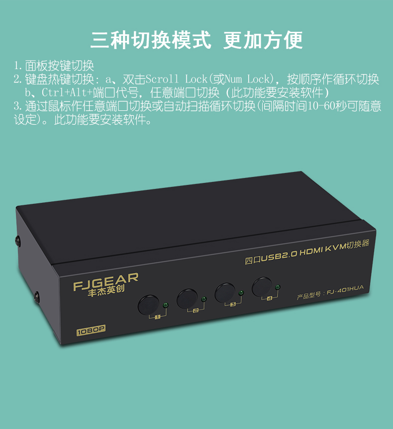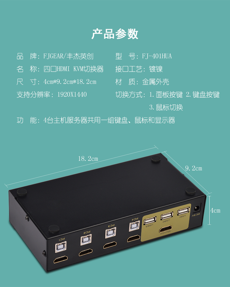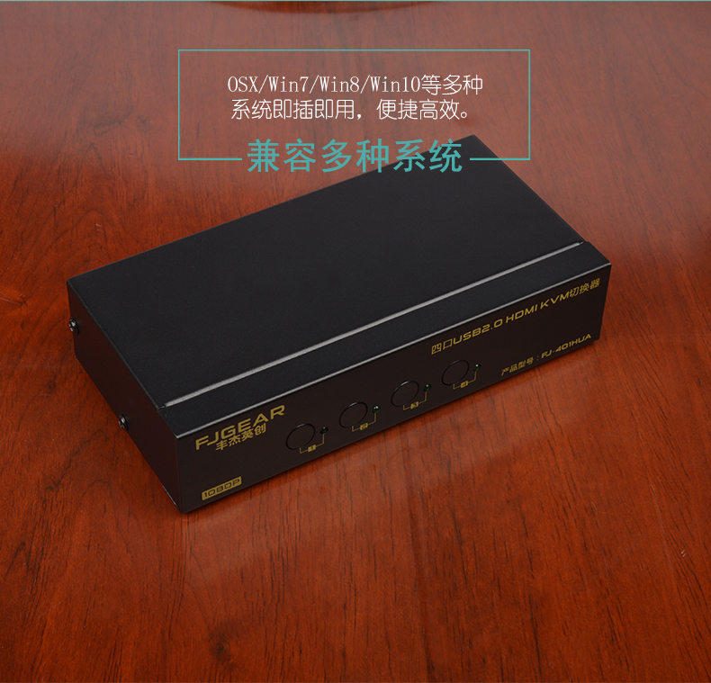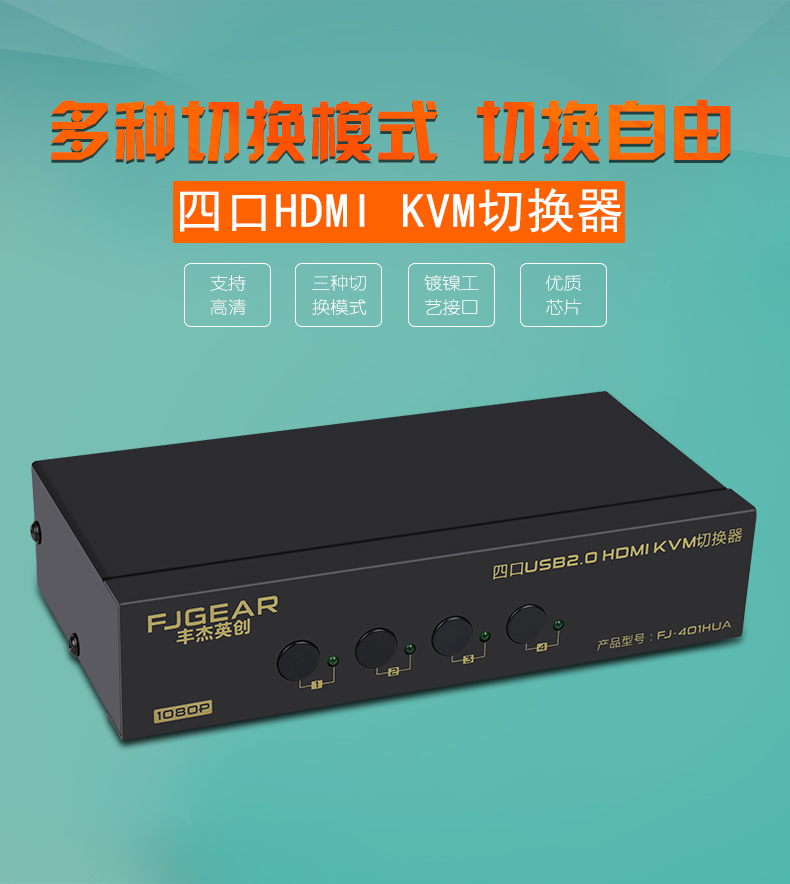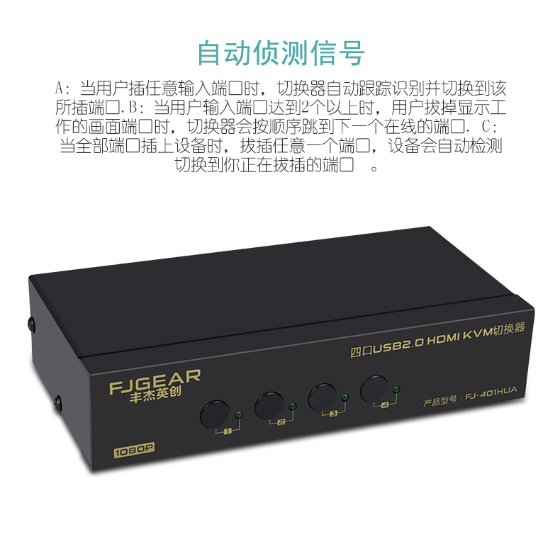 FJ-401HUA整合4端口KVM多電腦切換器,該款產(chǎn)品支持4臺電腦之間或是共它設備如游戲的HDMI信號切換,并讓使用者從單一控制端分享USB接口設備FJ-401HUA提供先進的獨立切換功能,使用者可通過前端面板按鍵及鍵盤熱鍵進行功能切換,該款產(chǎn)品同時具備顯示器動態(tài)同步顯示技術,可保持最佳HDMI顯示器顯示分辯率。