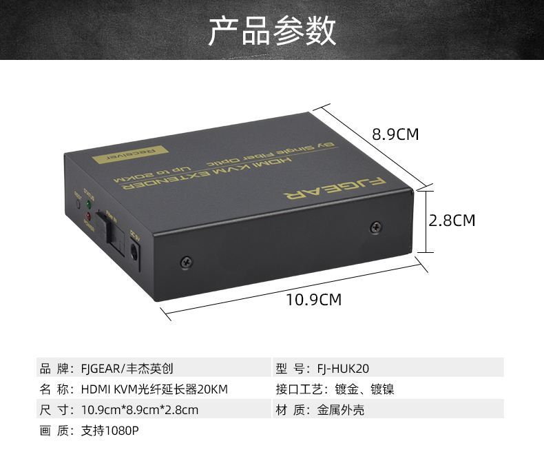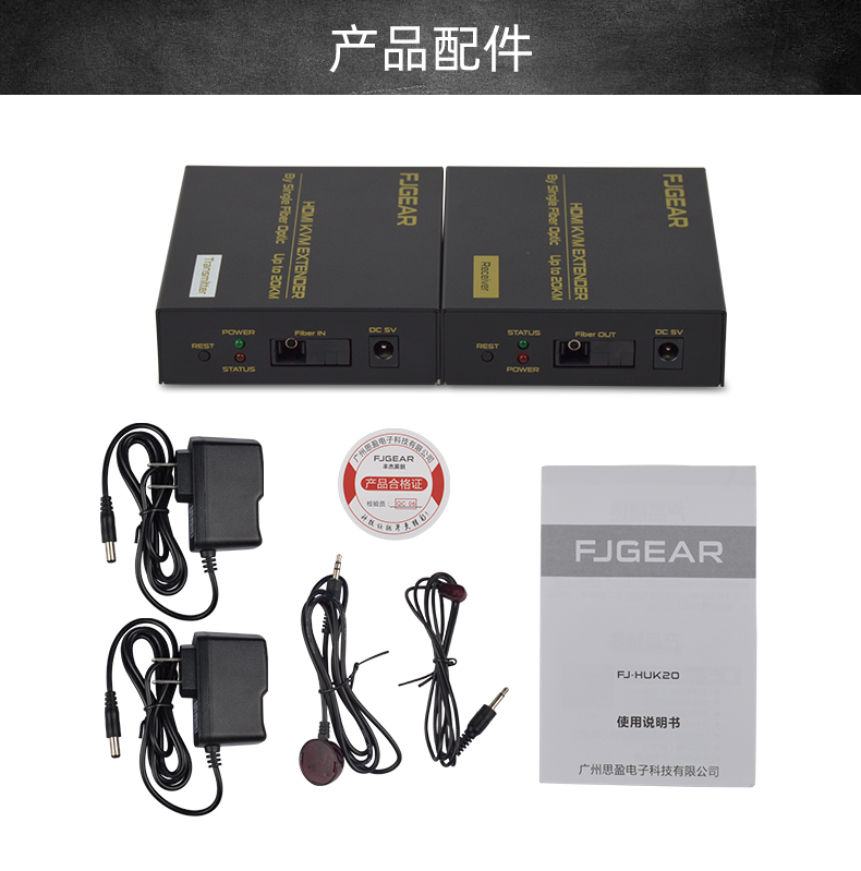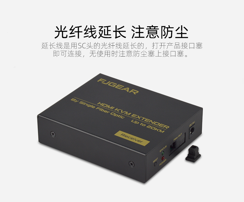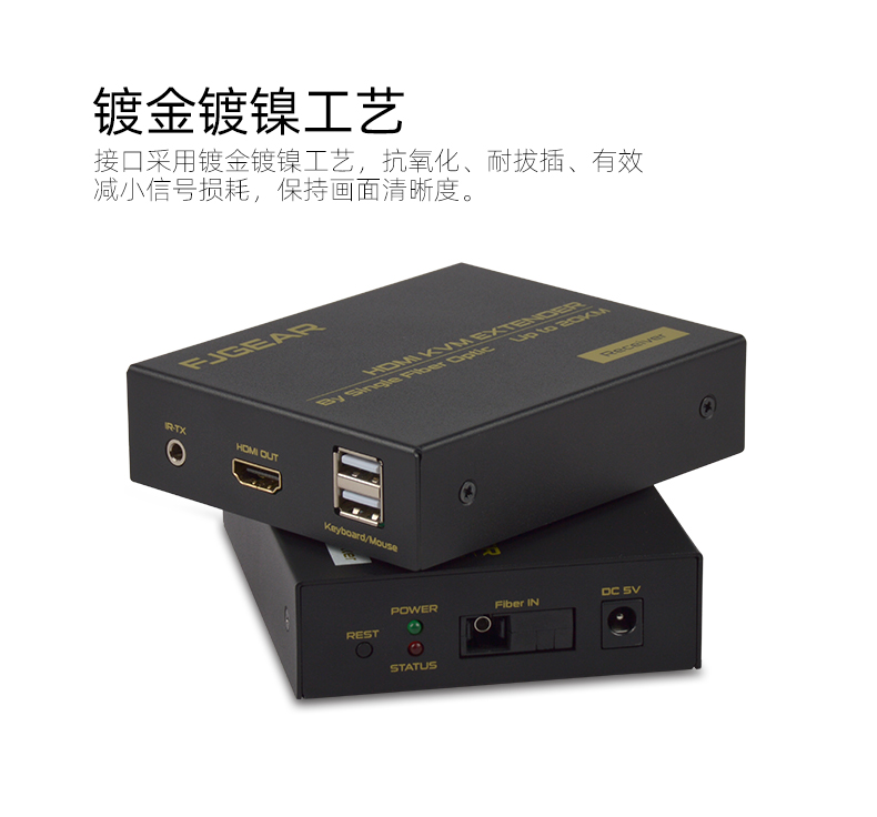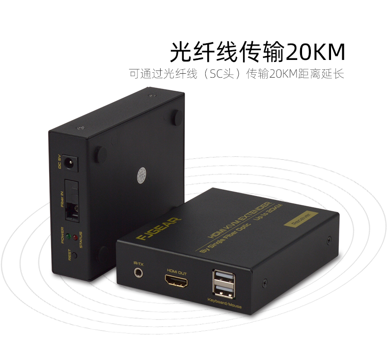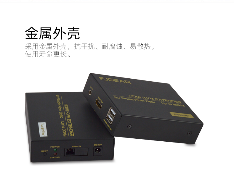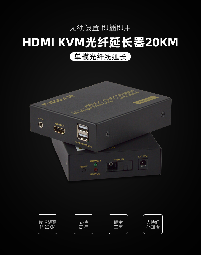 FJ-HUK20是一款高清視頻和USB鍵鼠的KVM延長(zhǎng)器,傳輸介質(zhì)是單模光纖線;它將一路HDMI高清信號(hào)和USB鍵鼠信號(hào)通過(guò)