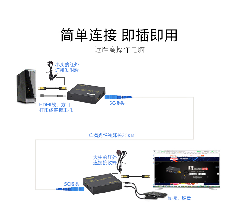 一條單模光纖線進(jìn)行傳輸,最遠(yuǎn)傳輸距離可達(dá)20公里;使用者可以在20公里外通過(guò)鍵鼠即可控制源端設(shè)備,廣泛應(yīng)用于各類