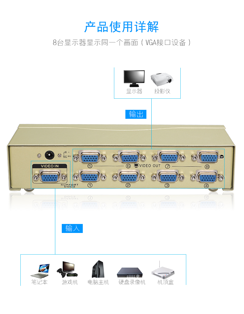 2:該系列VGA分配器有二路、四路、八路等多種端口