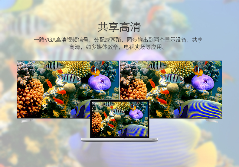 VGA視頻分配器是將一路VGA信號(hào)輸入通過集成芯片視頻分配成多路VGA信號(hào)輸出的視頻處理設(shè)備,具有高性能、大帶寬、視頻大功率模擬集成電路,多極點(diǎn)頻率補(bǔ)償及增益提升技術(shù)。