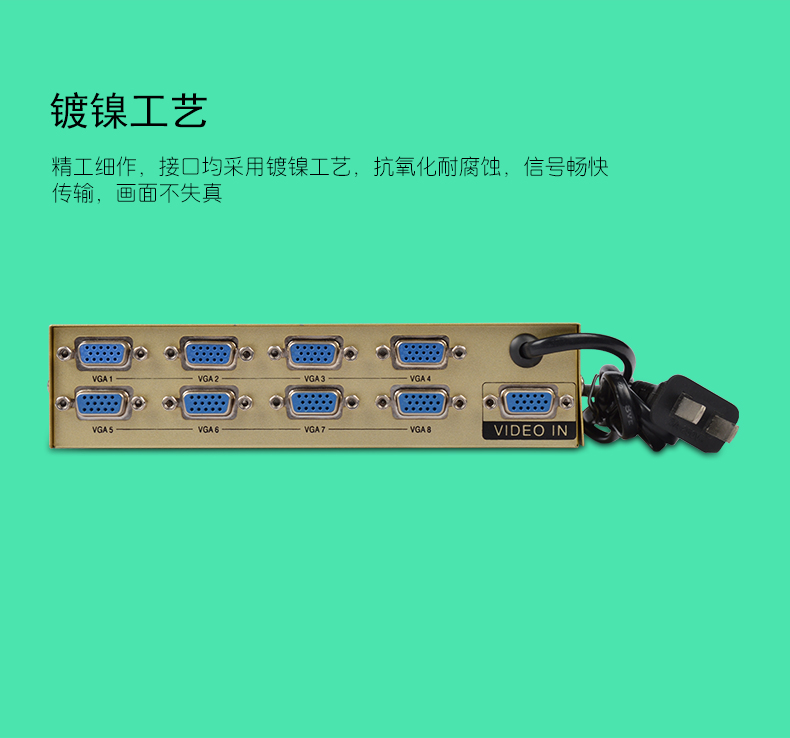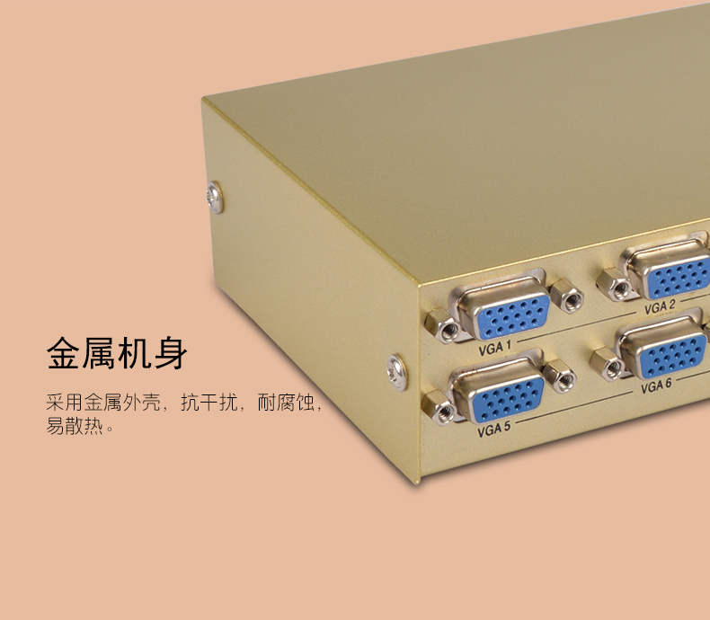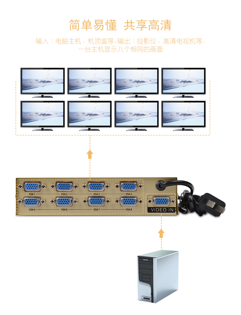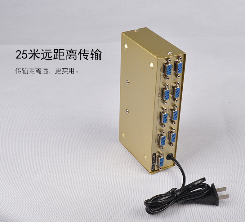 VGA視頻分配器是將一路VGA信號(hào)輸入通過(guò)集成芯片視頻分配成多路VGA信號(hào)輸出的視頻處理設(shè)備,具有高性能、大帶寬、視頻大功率模擬集成電路,多極點(diǎn)頻率補(bǔ)償及增益提升技術(shù)。
