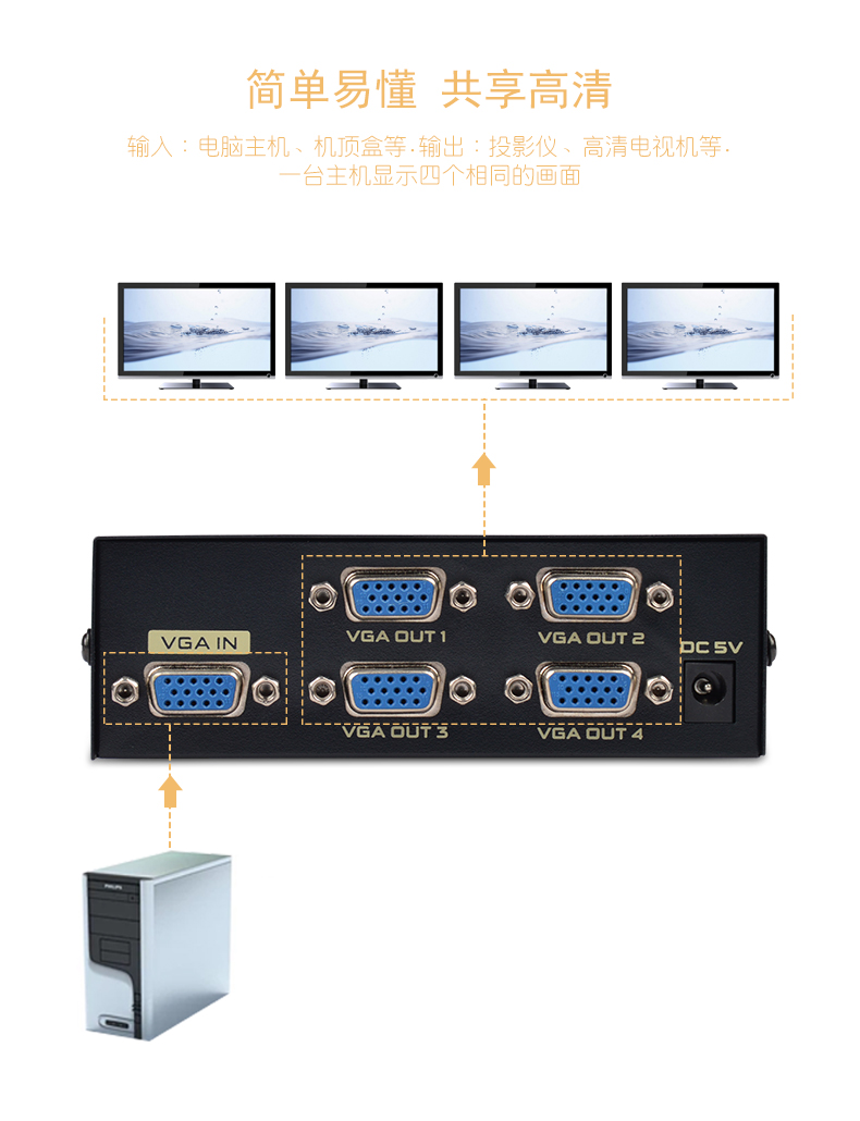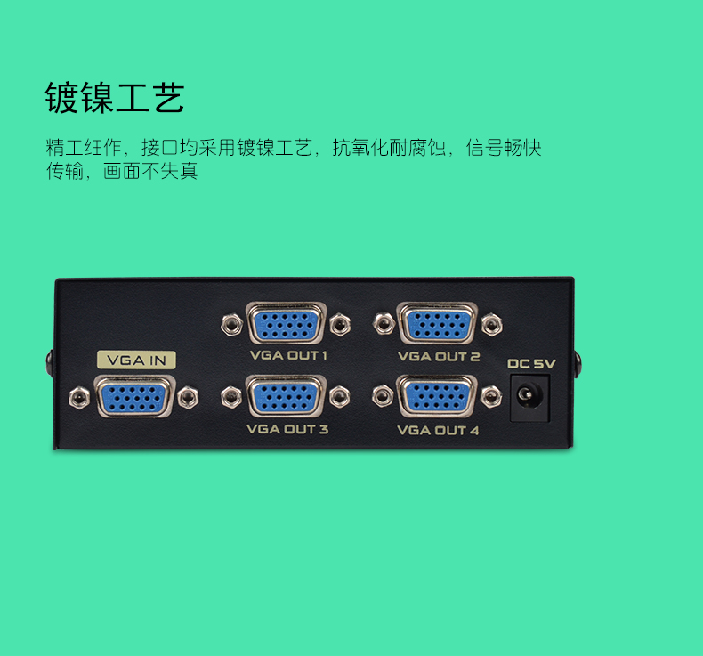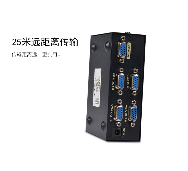 VGA視頻分配器是將一路VGA信號(hào)輸入通過集成芯片視頻分配成多路VGA信號(hào)輸出的視頻處理設(shè)備,具有高性能、大帶寬、視頻大功率模擬集成電路,多極點(diǎn)頻率補(bǔ)償及增益提升技術(shù)。