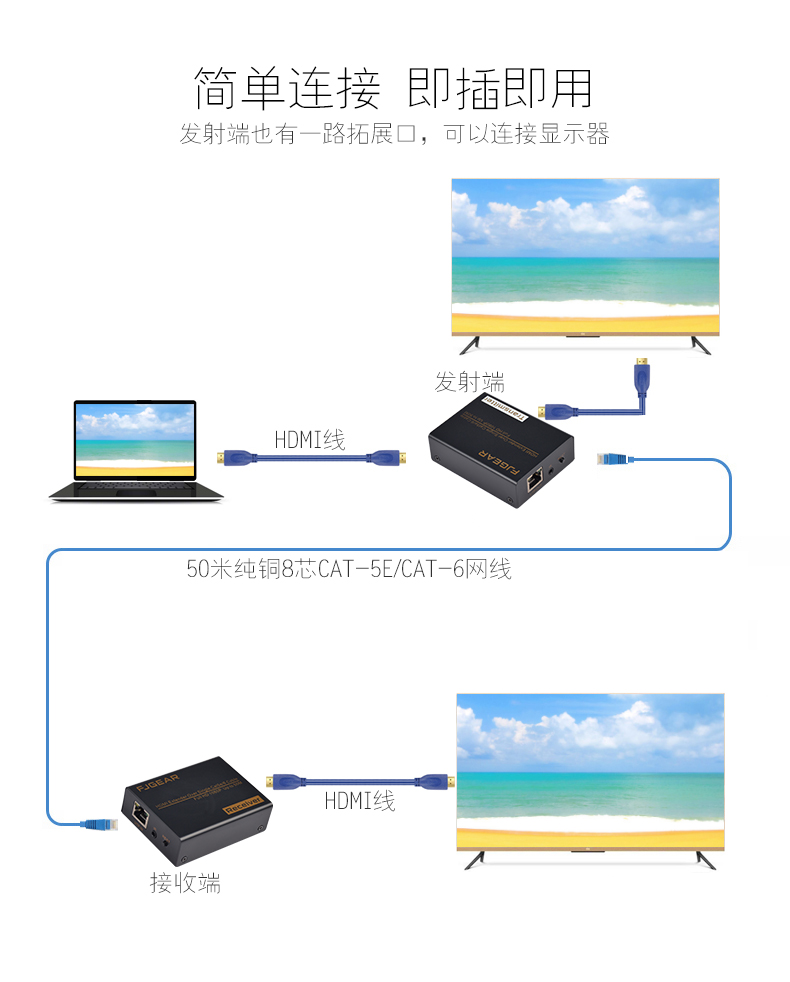 2.采用CAT-5E/6網(wǎng)線代替HDMI線來實(shí)現(xiàn)遠(yuǎn)距離傳輸