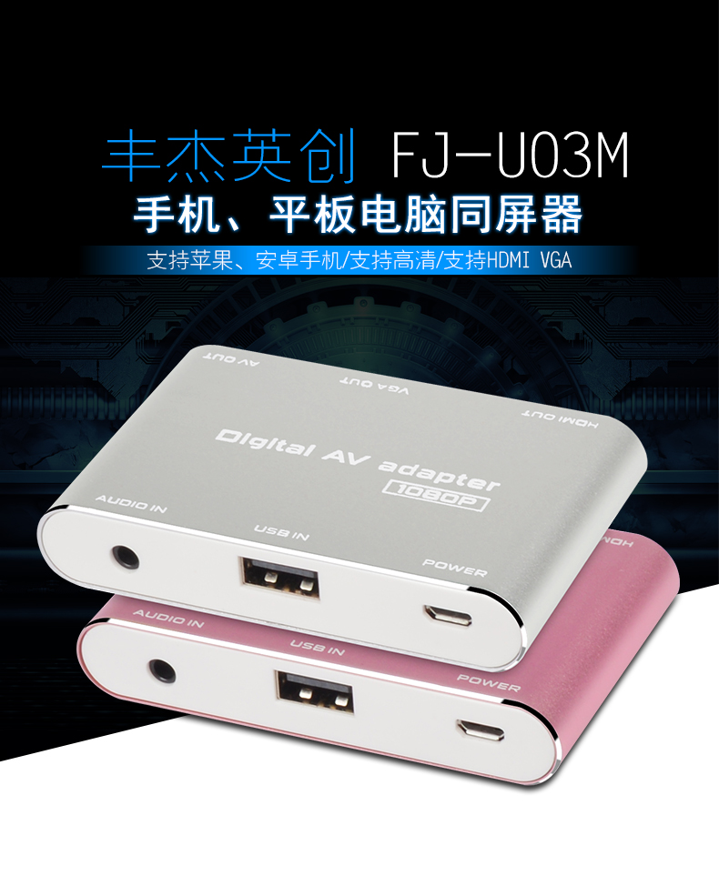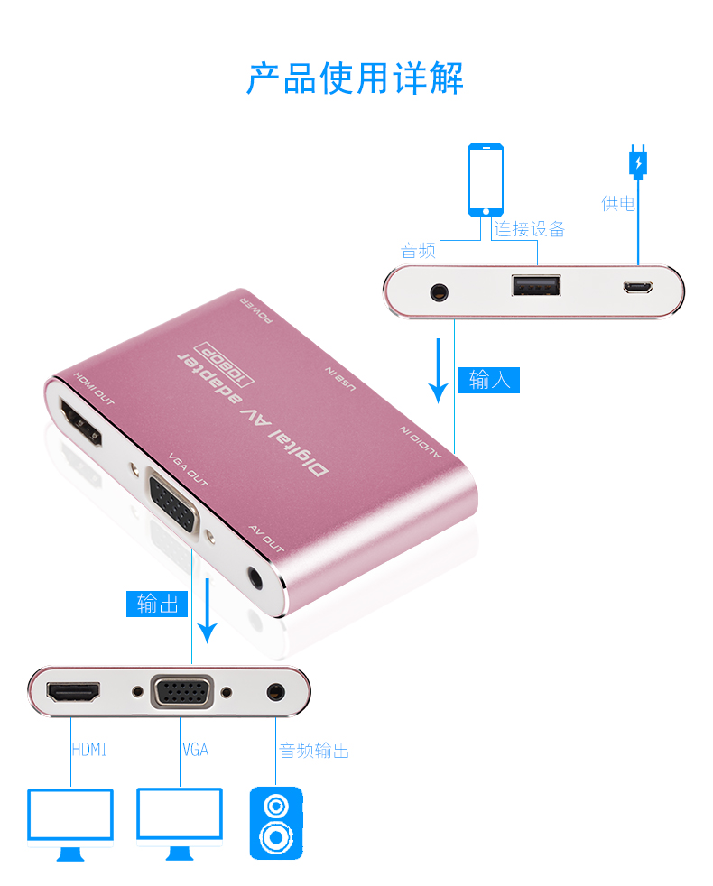 VGA/HDMI/AV/3.5mm音頻輸出,支持1920x1080p