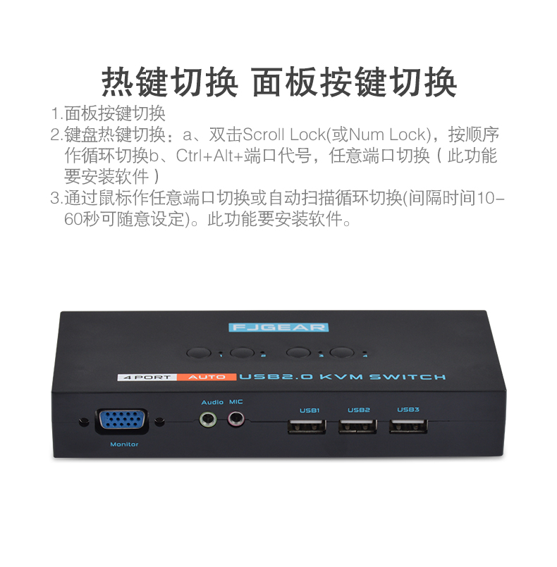 2、鍵盤熱鍵切換:a、雙擊Scroll Lock(Num Lock),按順序作循環(huán)切換。b、Ctrl+Alt+端口代號,任意端口切換(此功能需安裝軟件)。