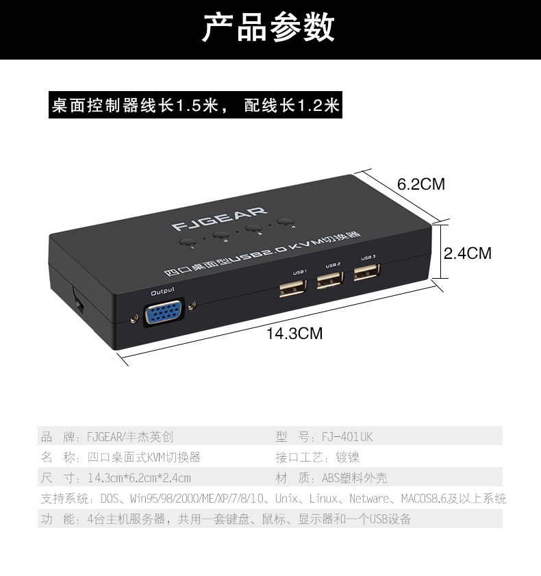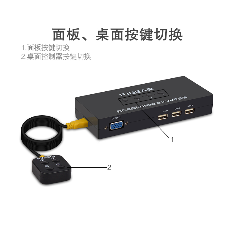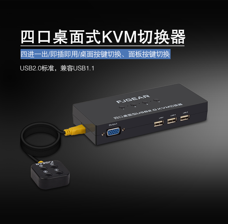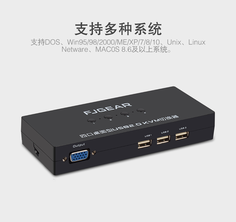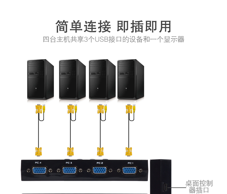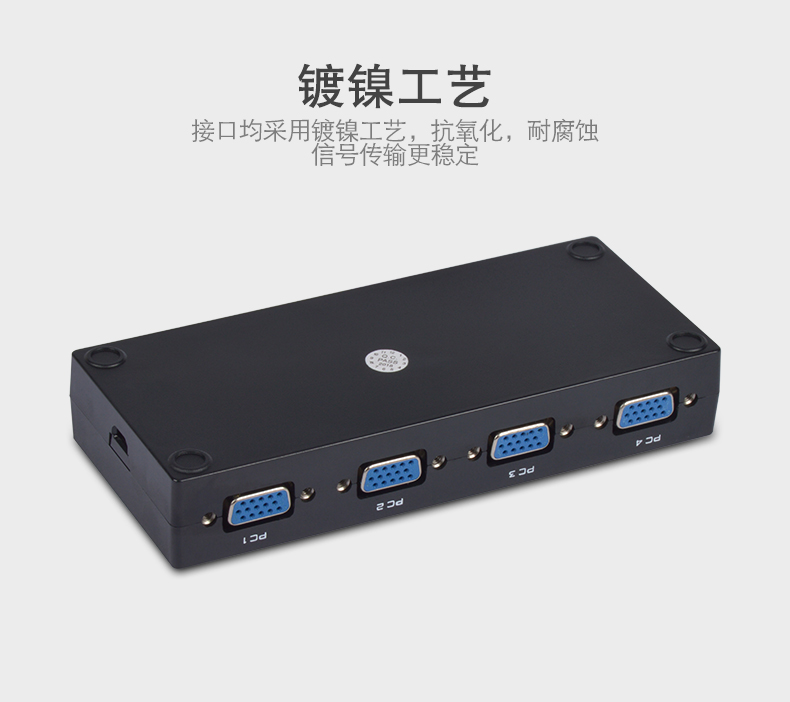 這是一款4口KVM切換器,它可以讓4臺(tái)電腦共享3個(gè)帶USB接口的設(shè)備(如打印機(jī)、掃描儀、多功能一體機(jī)、U盤(pán)、鼠標(biāo)、鍵盤(pán)、無(wú)線(xiàn)藍(lán)牙設(shè)備),用按鍵即可輕松切換;極大的提高了辦公效率,同時(shí)也節(jié)省了采購(gòu)成本和空間資源;這是家庭辦公及小型辦公場(chǎng)所的不二之選。