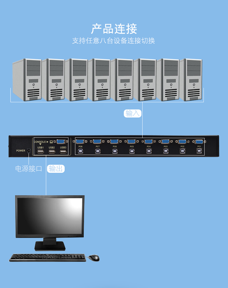 KVM切換器是將多臺(tái)電腦主機(jī)連接到一臺(tái)KVM上進(jìn)行操控,
