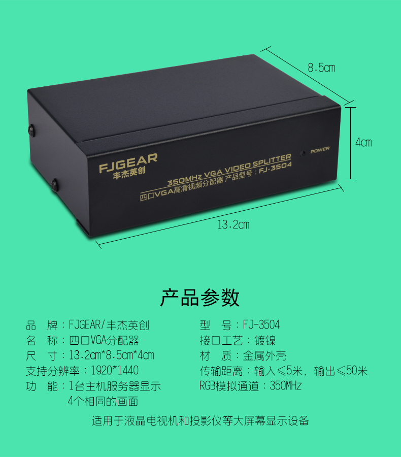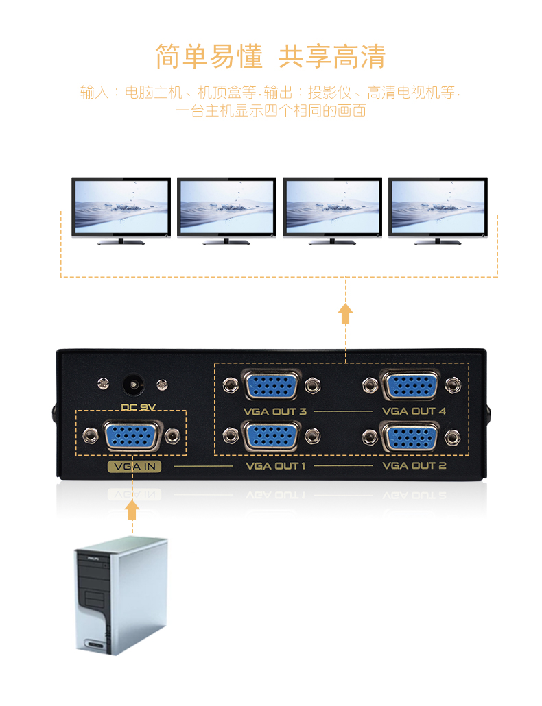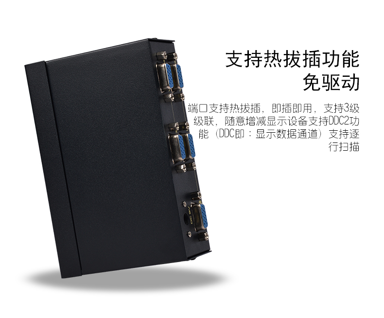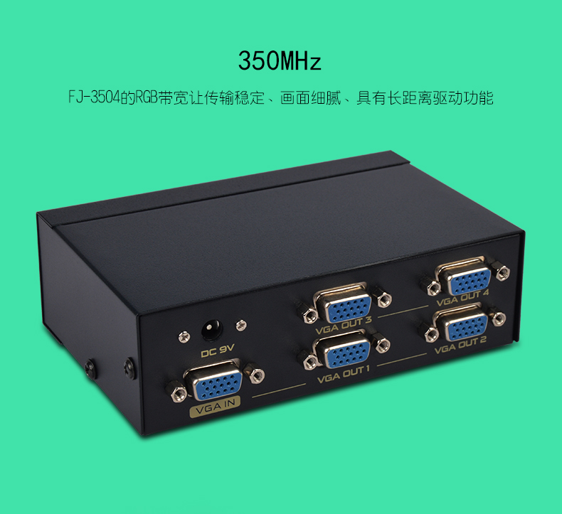 1:350MHz 系列VGA分配器是高清VGA信號分配器,適用于液晶電視機和投影儀等大屏幕顯示設備。具有長距離驅動功能