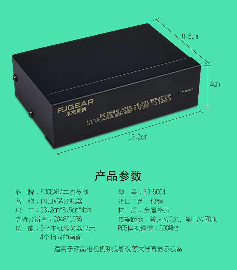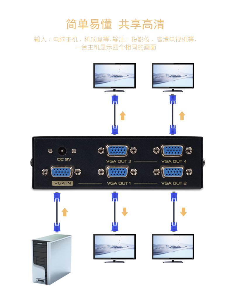 應(yīng)用于:視頻會(huì)議系統(tǒng),如:投影儀、大屏幕;VGA信號(hào)測試,如:顯示器、液晶顯示器;大眾傳媒如:服市行情、時(shí)刻表、教學(xué)場所;數(shù)據(jù)中心,咨詢臺(tái)等,通過它您只需要一臺(tái)主機(jī)便可共享4臺(tái)顯示器,它為您節(jié)省時(shí)間,金錢,設(shè)備,能源,是您工作的好幫手!