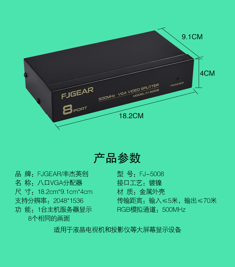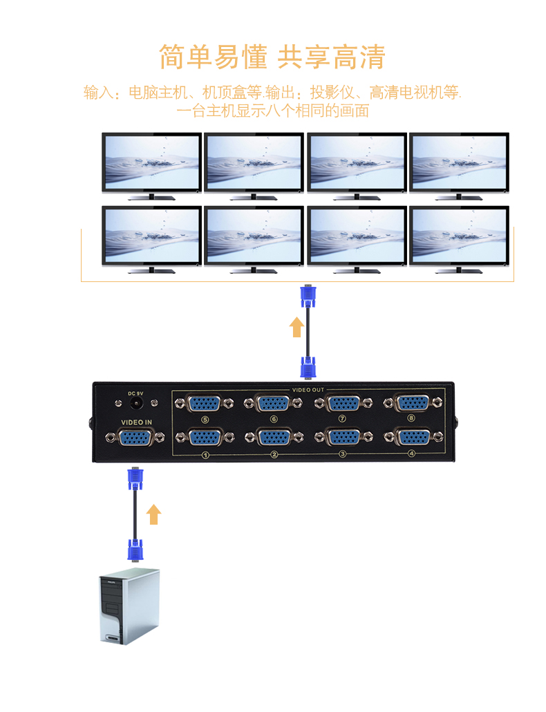 應用于:視頻會議系統(tǒng),如:投影儀、大屏幕;VGA信號測試,如:顯示器、液晶顯示器;大眾傳媒如:服市行情、時刻表、教學場所;數(shù)據(jù)中心,咨詢臺等,通過它您只需要一臺主機便可共享8臺顯示器,它為您節(jié)省時間,金錢,設備,能源,是您工作的好幫手!